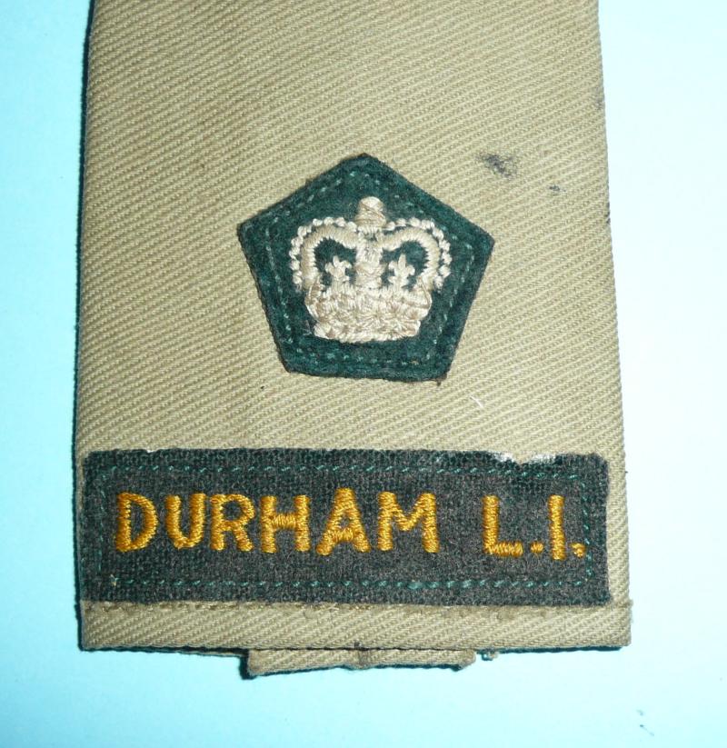 A scarce regular DLI Officer's shoulder shirt sleeve order slip-on epaulette, early 1950s, worn post war and during the Korean War era. Genuine and very good condition, with no mothing, a few marks. Title circa 6.3cm wide and 1.8cm high. This smaller title was unique to officers of the Regiment. Queen's crown rank crown would date this particular item to post 1952.