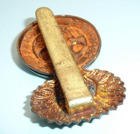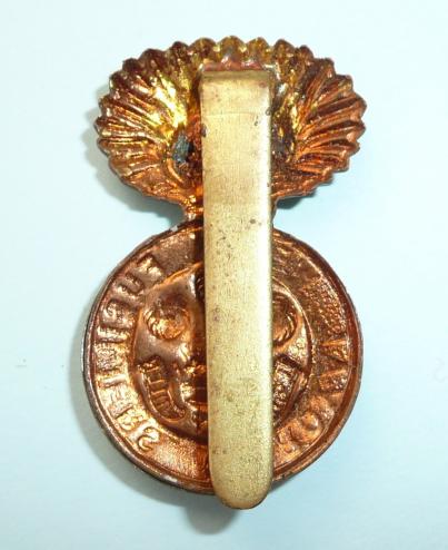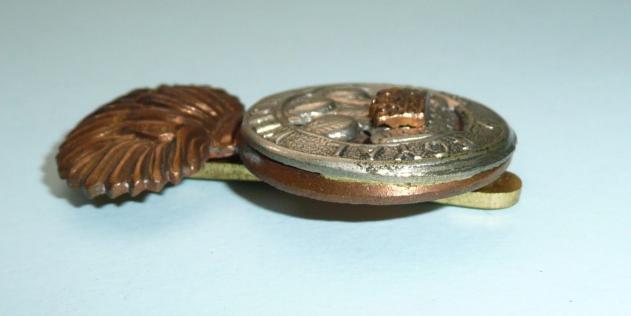 A post 1920 pattern (Welch spelling) of two part construction, with original slider to the reverse. A white metal mounted device. A very flat example (very little dome in the grenade - see photo). Some polishing to tips of feathers otherwise in good condition.