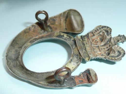 A die struck white metal right facing curled bugle horn with large Victorian crown above and two original dark toned lugs to the reverse. Circa 5.2cm wide and 5.4cm tall. In very good condition.