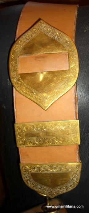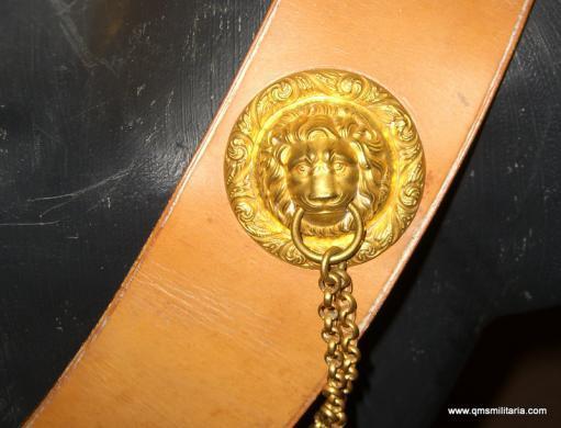 A magnificent Officers shoulder belt plate and pouch with king's crown badge to pouch, indicating the period 1902 - 1908. Tan leather with gilt fittings, in near mint condition. Odd mark to leather, but nothing to worry about. The belt is complete with a fire gilt lion-head boss and two-strand gilt chain connected to the gilt whistle and holder.
