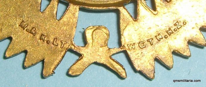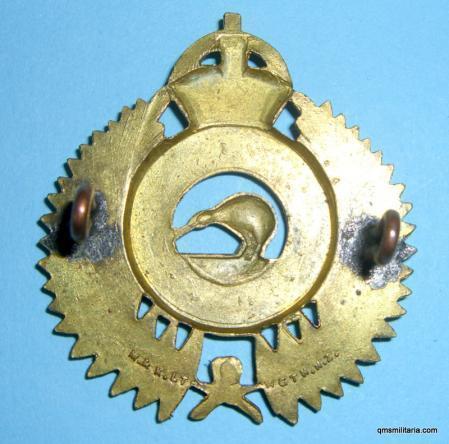 An attractive die cast badge, maker marked M. &.K. Ltd, WGTN, N.Z. (stands for which stands for the jewellers Mayer and Kane Ltd, Wellington, New Zealand). A Kiwi within a circle inscribed 'New Zealand Regiment'. enclosed by fern leaves and surmounted by a crown. Two original cooper loops. Circa 4.3cm tall and 4cm wide. A strong stiff badge with sharp detail.
