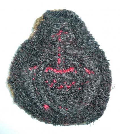 An embroidered cloth formation sign with a downed aircraft on the silhouette of a black cat whose tail is curled to the shape of the figure nine. Provided air defence for Cardiff and South Wales Posts. Circa 4.7cm by 4.8cm. Removed from uniform and cut to shape otherwise in very good condition.