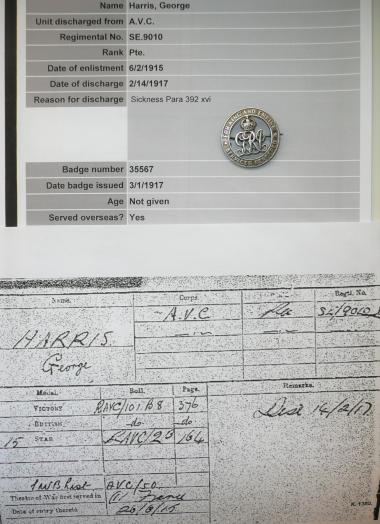 WW1 Silver War Badge (SWB) to George Harris, Army Veterinary Corps (AVC)