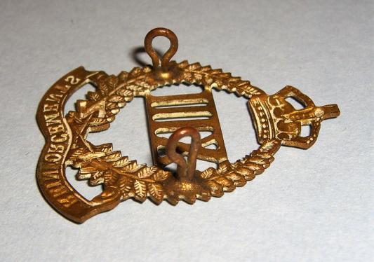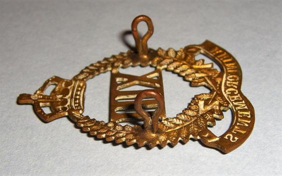 A gilding metal die struck cap badge with two original loops to the reverse. Circa 4.3cm tall. Some slight darkening to left of scroll otherwise in very good condition.