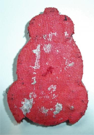 A post 1953 silver and gold wire embroidered example with red centre on red backing. Removed from cap with some traces of bluetack to reverse. Small moth nip to top right edge otherwise in good condition.