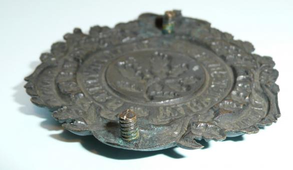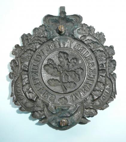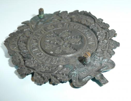 A die struck blackened brass cross-belt plate with a with two original screw bolt fittings to the reverse (north-south). An attractive design incorporating a spray of oak leaves with acorns to the centre of a crowned circlet bearing the title within a wreath of oak leaves carrying the motto: "Labor Omnia Vincit". In extremely good condition with no damage or significant wear to finish. Circa 6.5cm by 5.8cm.