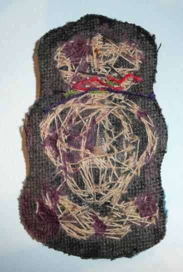 Queen's crown silver bullion wire embroidered NCO's sleeve badge. The " Q O " cypher surmounted by a red inset crown on a blue backing. In very good condition. Pre 1993.