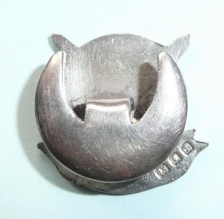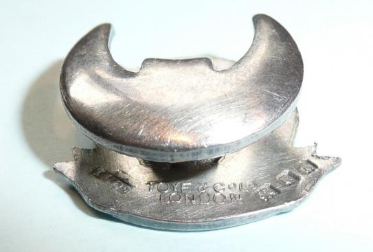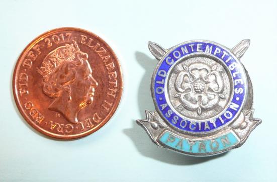 A small and attractive enamel and hallmarked silver buttonhole lapel badge for a Patron of the Old Contemptibles Association. Enamel in good undamaged condition. Maker marked Toy & Co Ltd London (under the horseshoe fitting) and also T & Co to reverse and hallmarked silver stamps for London 1932 (date letter R). Circa 19mm in diameter and in very good condition. Scarce.