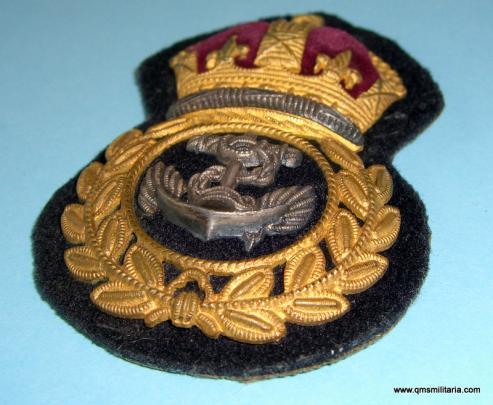 A good original Second World War period Royal Navy Chief Petty Officer economy issue cap badge, silver metal fouled anchor set within a gilt metal crowned wreath, the reverse with black hessian backing. There has an additional tape sewn on for display purposes, easily removed should you so wish. Very condition. Circa 7.1cm tall.