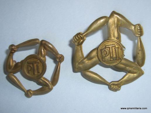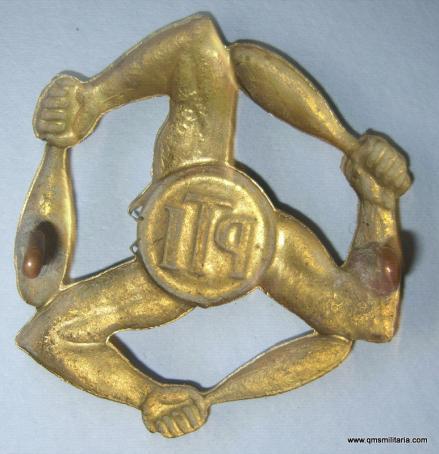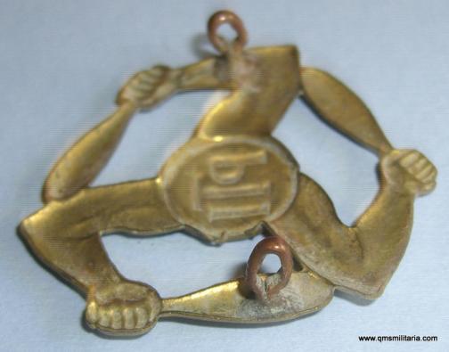 This pattern was introduced in 1923, made from brass gilding metal. It is an especially attractive badge depicting three muscular arms, each wielding a club. This is the larger pattern version for sale here (the smaller one is depicted for comparison purposes only and listed for sale below). It is 4.2cm across.