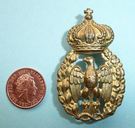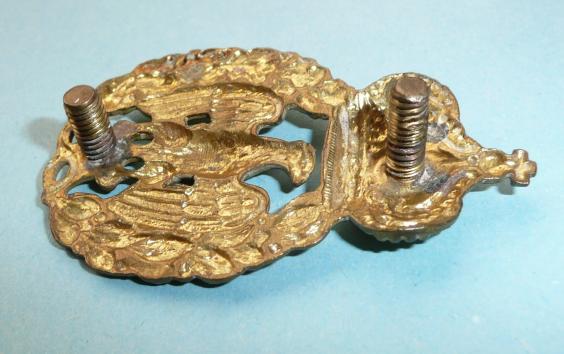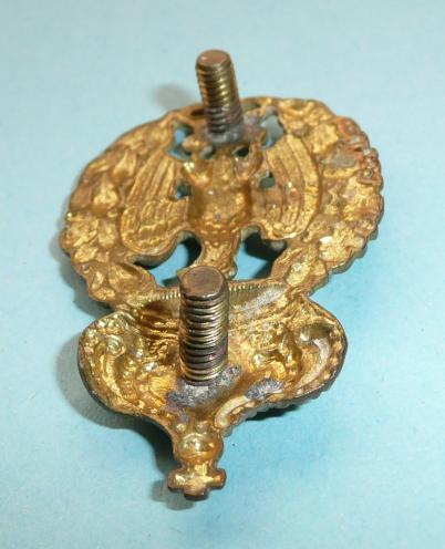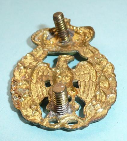 Two screw posts but missing its securing nuts which tended to have the makers details A Binda Milano. In very good condition. Circa 52mm tall. Worn on the shoulder boards. Sometimes found with blue paint to the background of the crown, The cap badge tended to be made of cloth or bullion.