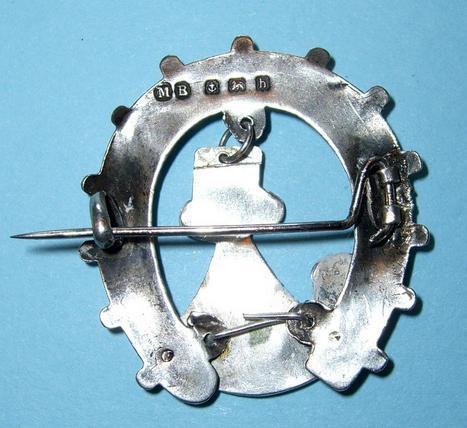 Has a lot of knocks to the hollow silver construction, possibly a replacement pin. Circa 3.5cm tall. Hallmarked silver with Birmingham assay marks for 1907.