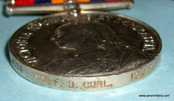 He was also entitled to Delhi Durbar Medal 1911, the Mons Trio with clasp and the Memorial Plaque. Died of Wounds on the 30th October 1914 with the BEF, buried at Ypres in France & Flanders. Copies of: MIC, CWGC certificate, his entry in the Marquis De Ruvigny's roll of honour, the Flamstead ( Hertfordshire ) war memorial roll, the entry relating to him in Ducker's Delhi Medal roll as his entry in UK Casualties of the Boer War. His brother, Private Harry Curl (Service No. 2566) served in the same Regiment at the same time but seems to have survived the war and was in the 14th Hussars by 1918.