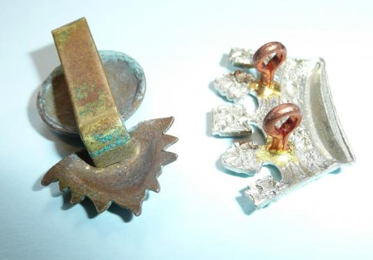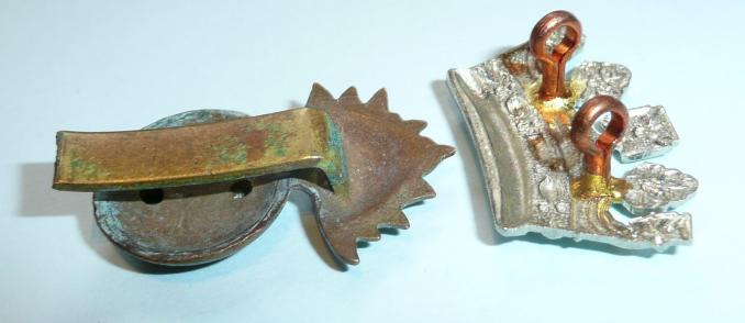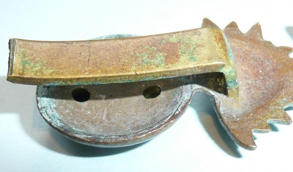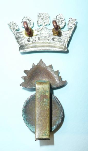 A die cast bi-metal greande cap badge with original slider to the reverse (clipped) and a separate die struck white metal coronet with two original loops to the reverse. Grenade has a small sweat / braising / expansion holes to the reverse.