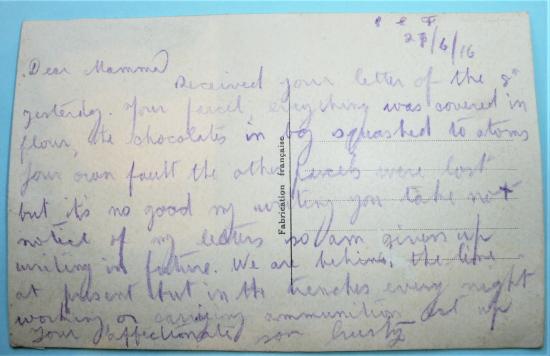 In good condition, but with a very interesting contemporary coloured pencil message to the reverse dated 27th June 1916 which appears to have got passed the censor.