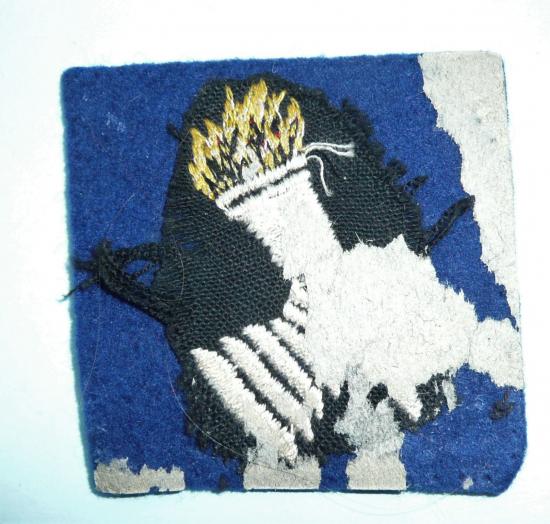 Removed from uniform with some traces of paper stuck to the reverse otherwise in very good condition. A white mailed fist holding a torch of learning on blue felt with a black hessian backing.
