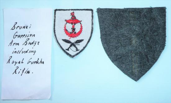 Both in unissued condition the smaller is the garrison patch and is red and black embroidery on green twill. The larger of black, yellow, silver and white embroidery on green twill represents the British Army Training Team, Brunei. Both badges worn on the arm.