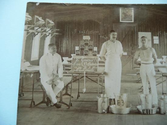 Ifs bully beef tonight lads! Cooks of E Company display their tins of Fray Bentos and very helpfully a set of blackboards confirming the battalion's identity. The date 1912 places them inside a barracks located in South Africa as this is where they were stationed at that time.