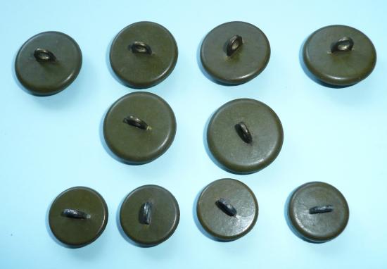 A useful batch of 10 x British Army GENERAL SERVICE BUTTONS. This batch consists of 6 large (25mm) buttons and 4 medium buttons (19mm) - made from a type light brown plastic, fixed shanks and blank reverses. These buttons came out around late 1942 to save on brass which was needed for munitions. These were commonly found on greatcoats and ATS War Economy jackets and greatcoats. This batch are issued and used, but still have good detail and are in good condition.