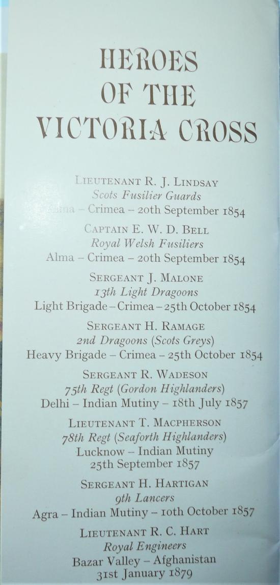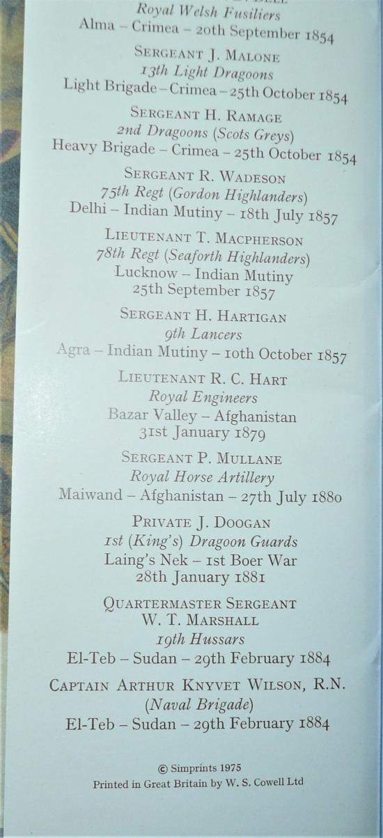 In plastic sleeve with coloured card folder, a full set of all 12 embossed coloured plates, or panels. This is a quality reprint produced in 1975 of the 1887 set of 12 colour plates depicting winners of the Victoria Cross from the Crimean War to the 1st Boer War (1854-1884). Originally issued for the Jubilee of Queen Victoria in 1887 by The Kensington Fine Art Association.