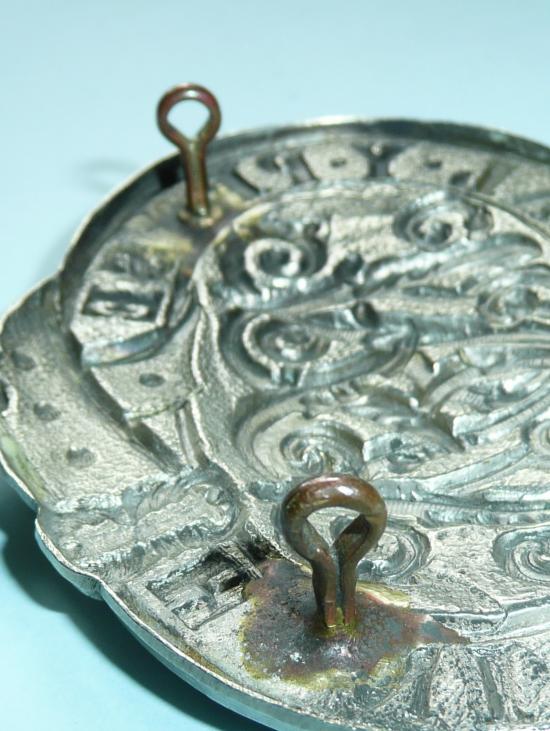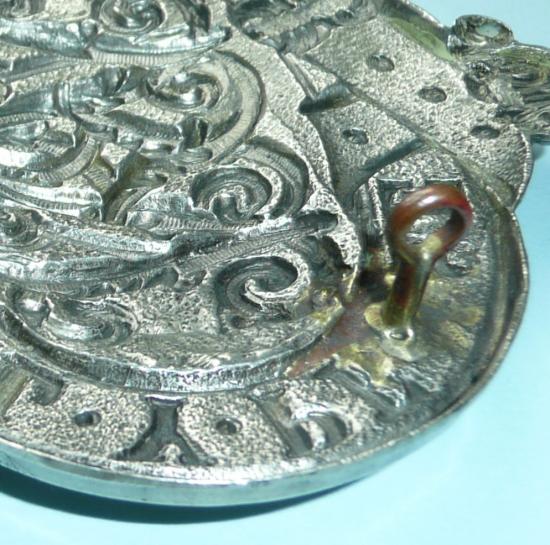 A fine rare example following the pattern used by the Grenadier Guards but heavily die-stamped in thick white metal with four dark toned loops to the reverse. A large item at circa 10.5cm.