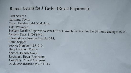 The official records would have it that Sapper Taylor was wounded on 18th June 1940, but this was probably when he was processed on arrival at a casualty station in England.