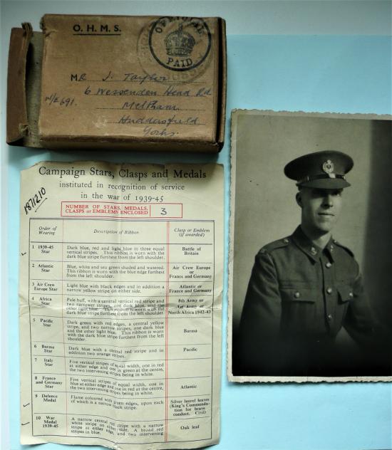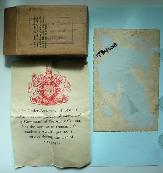 A good group of three medals, the 1939/45 star, Defence and 1939/45 War medal all awarded to 1871210 Sapper J Taylor of the 7th Field Coy (the shiny 7th) Royal Engineers. It comes with the original named and addressed box of issue (Huddersfield, Yorkshire address), medal issue slip and a photograph of Taylor in uniform. The medal issue slip confirms Taylors service number and forces war records can confirm that Taylor was wounded in action in France in June 1940.