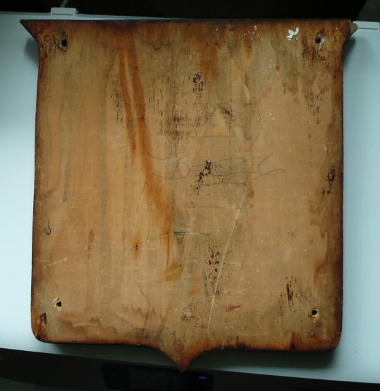 A large wooden shield which I imported from Canada many years ago. Apparently it was displayed in a military college in Canada. The WW1 pattern cap badge has been beautifully recreated in oils. The No '43' below is a mystery but perhaps had a relevance when displayed in the college which I cannot discern. Very slight damage to one flame tip on badge, otherwise from the front has a really good look to it. On the reverse, one corner has damage but this does not translate through to the front nor detract. Drilled for mounting on the wall. No wood worm damage. A one off unique item. Circa 29cm tall and 28.5cm wide. The penny is included on one of the photos to give a sense of scale.