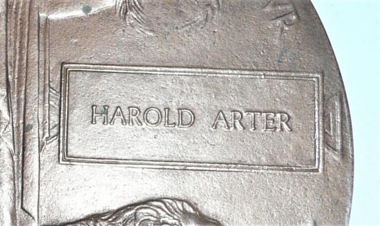 Full size original plaque or Dead Man's Penny, named to Harold Arter. Wide H in "He" variety with the "W" for Woolwich Arsenal on the reverse. In very good condition.