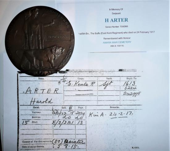 There is only one 'H. Arter' on the CWGC site as a casualty (all the others have more than one initial or forename). The CWGC site states that this is T/242995 Sergeant H Arter 1st/5th Battalion East Kent Regiment who died on the 24th February 1917 and is remembered in the Amara War Cemetery in Iraq.