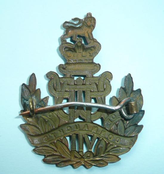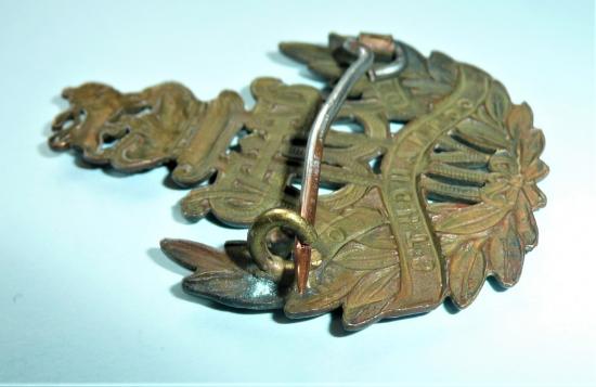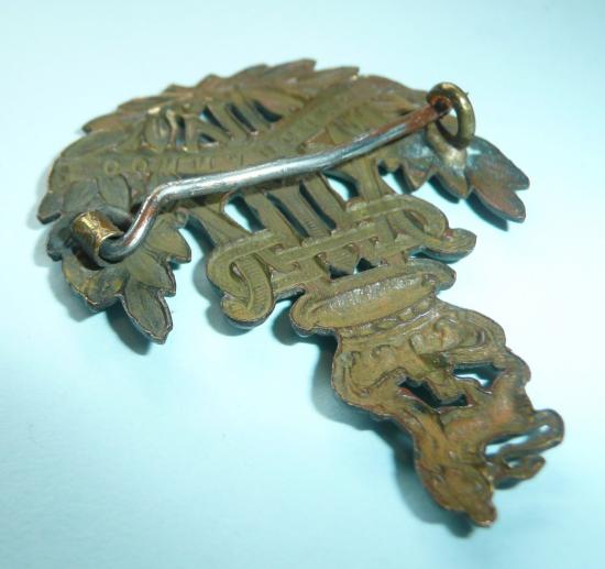 The monogram ('A', 'W', 'P' and a reversed 'P' - probably for Prince Arthur William Patrick), surmounted by a royal crest with an Imperial Crown, with a wreath and a scroll bearing the unit title, 'Duke of Connaught's Own', and the unit number, in Roman numerals, 'VII'.