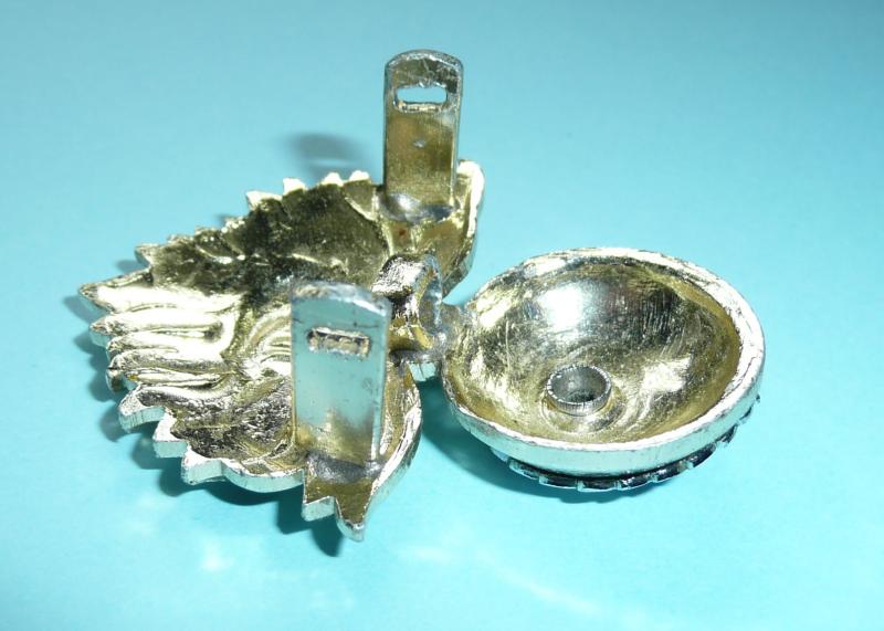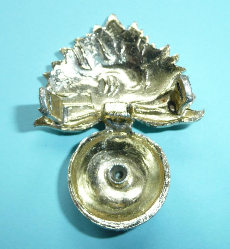 British Army The Royal Regiment of Fusiliers Cap Badge with long flat loops and a socket for the red over white feather hackle (the latter not included). In good condition with some minor service wear. Queen's Crown pattern.