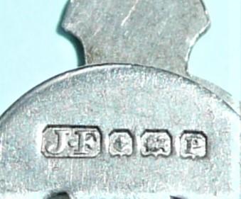 In very good condition with silver hallmarks finishing in letter "P" ( 1939). Maker marked. Dark. One more usually encounters Date letter "O" for 1938. Circa 2.7cm tall.