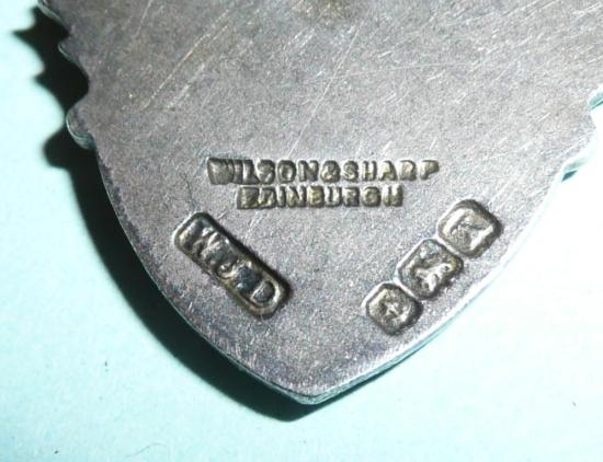 An intriguing piece with a super quality miniature Scots Greys Cap Badge in silver with enamels above a red enamel heart containing a hand reaching towards a kneeling figure atop of a cliff. Initially I thought this was masonic, but then concluded it was more about duty and love of country, so most likely a patriotic reference. Any information welcome. To the reverse are the maker's details Wilson & Sharp, Edinburgh, WJD and also Birmingham assay marks for 1922 (letter X). Suspension ring to reverse.