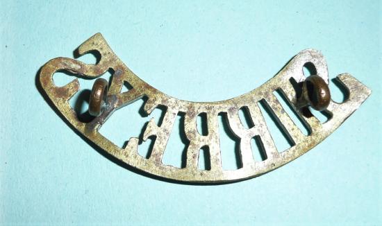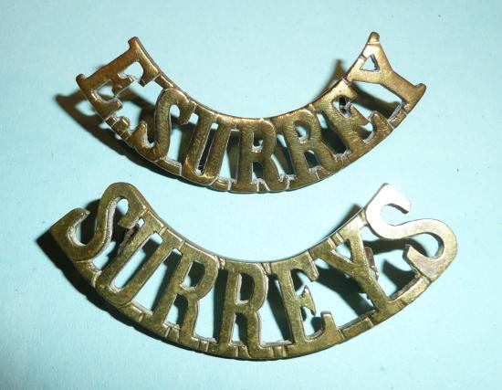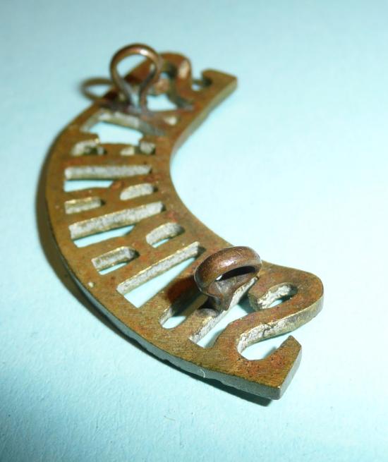Slightly larger than the usual E.Surrey title with two original loops to the reverse (see final photo for a comparison between the two, the E. Surrey title beinf sold elsewhere on this site - see item 63954). According to Westlake (p90) worn only by the 2nd Battalion in India just prior to the outbreak of WW1. Slight service wear, otherwise in very good condition. Scarce.