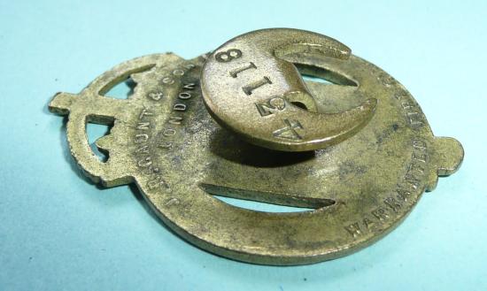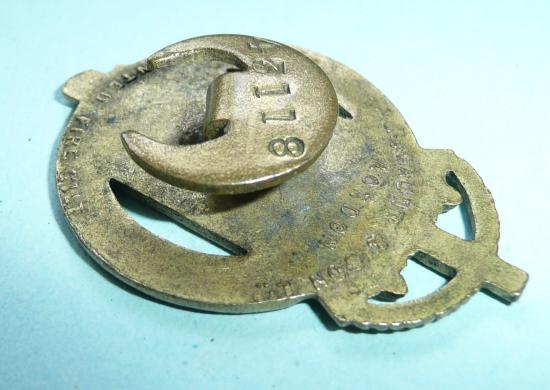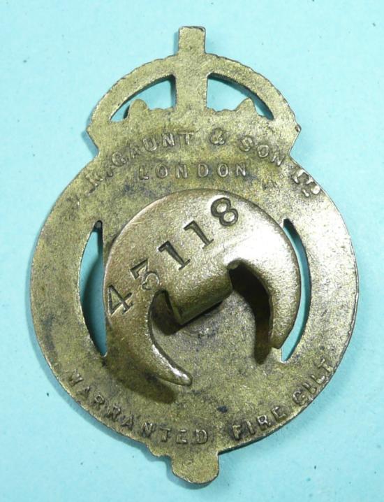 A pleasing example, some light dulling to gilt finish otherwise in very good condition with issue number 43118 and maker marked JR Gaunt & Son Ltd. London, warranted fire gilt. An official issue, a crowned strap, shield to voided centre depicting crossed cannon guns. Circa 4.4cms tall.