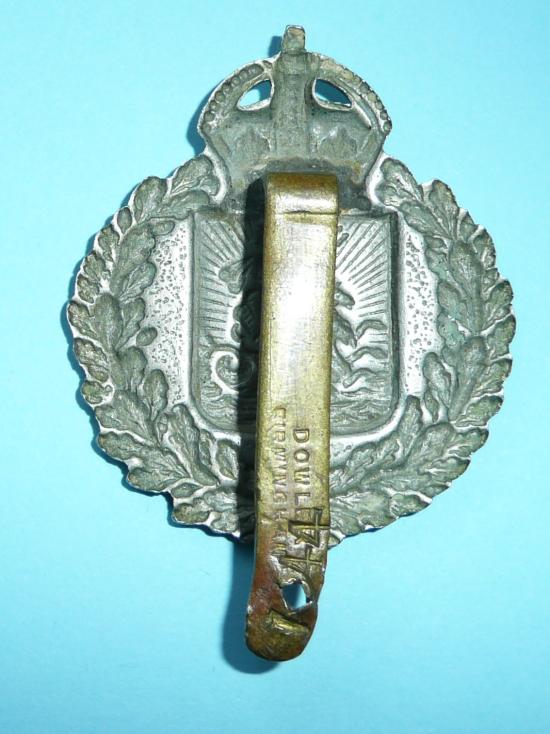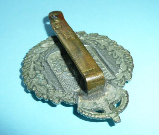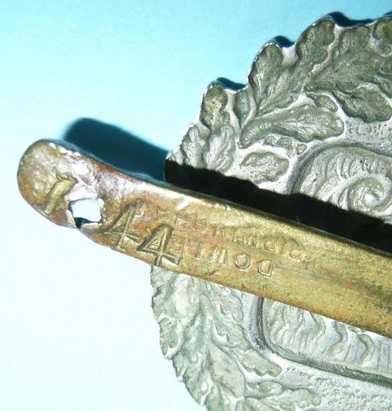 A die struck example with sharp detail and original slider. The slider has been stamped Dowler, Birmingham, but has been overstamped with an issue number (144) which has damaged the tip of the slider. A hole has also been punched through the tip of the slider by the owner, presumably for securing the badge to the hat, otherwise in good condition.