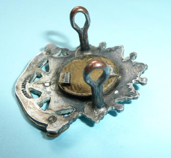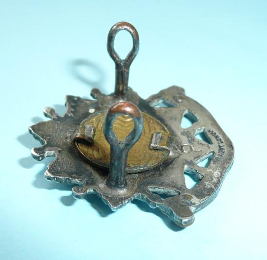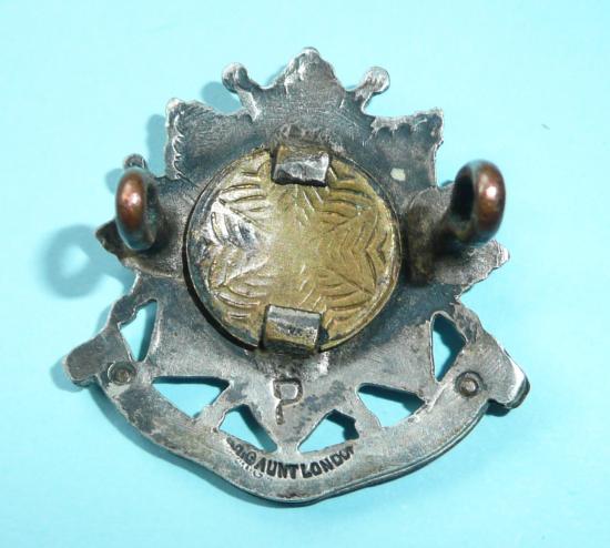 A collar sized cap badge with two very long loops and of two part riveted construction, marked 'P' for silver plate and maker marked JR Gaunt London. The gilt now polished back to the brass. Blue enamel to centre looks a bit dusty but appears intact. Scarce.