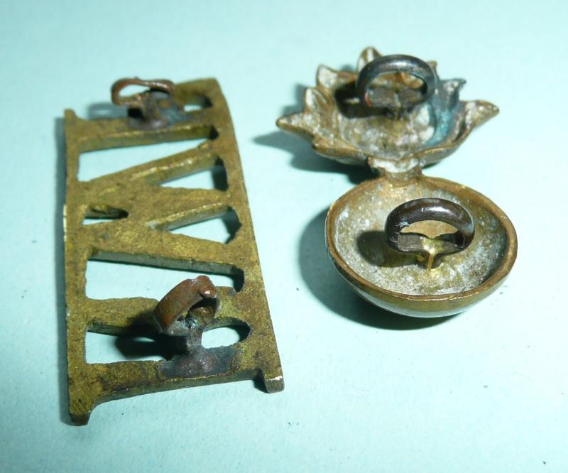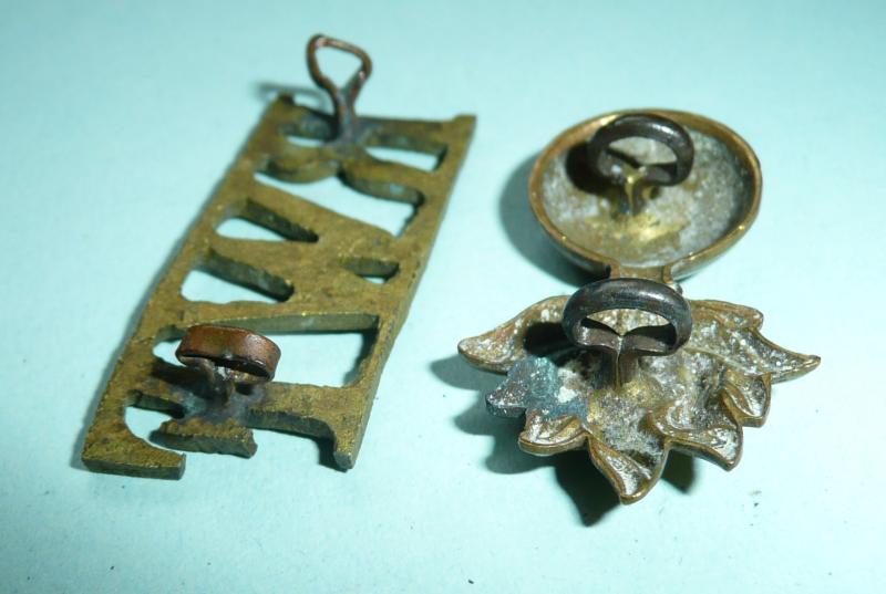 The Grenade is die struck with two original dark toned loops. The RWF is cast brass with two original but thin copper loops (some service wear). Possibly theatre made when in India. Westlake claims RWF was worn from 1898. Owner claims this was made in 1881 when they first became the Royal Welsh Fusiliers.