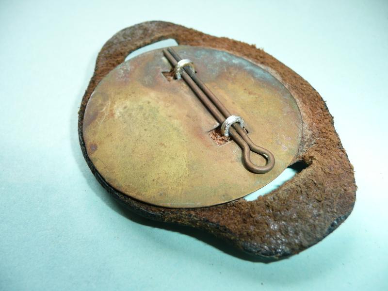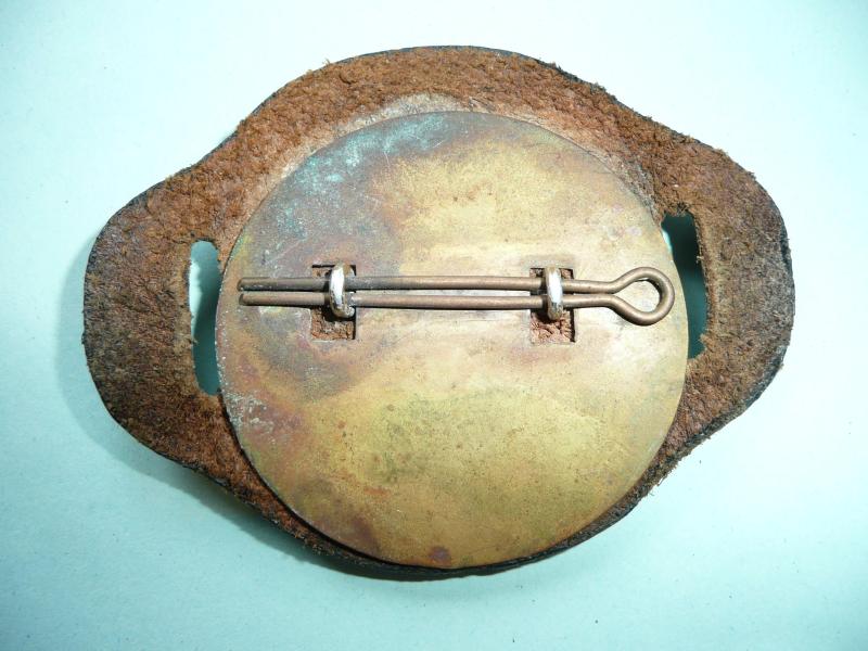 Anodised QE2 Crown on Black patent leather wrist fitting, with backing plate and cotter pin, but missing the wrist strap. Leather cracked from wear and some staining to reverse but otherwise a pleasing example and black backing suggesting as worn by Sergeant Majors' of Rifle / Gurkha regiments.
