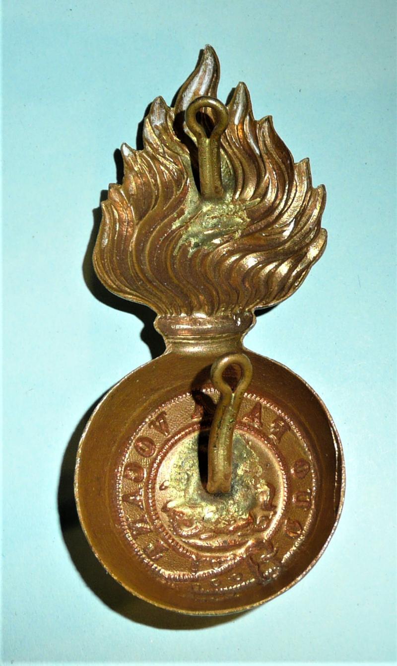 A large die struck Other Ranks brass seal skin cap grenade in the form of a flaming grenade bearing St George and Dragon within motto strap as worn by the Northumberland Fusiliers. Two original stout long loops to the reverse (bent upwards for ease of display / storage). Circa 9.7cms tall and 4 cms wide. A good stiff badge in very good condition. Worn 1880 - 1939, when full dress was finally discontinued.