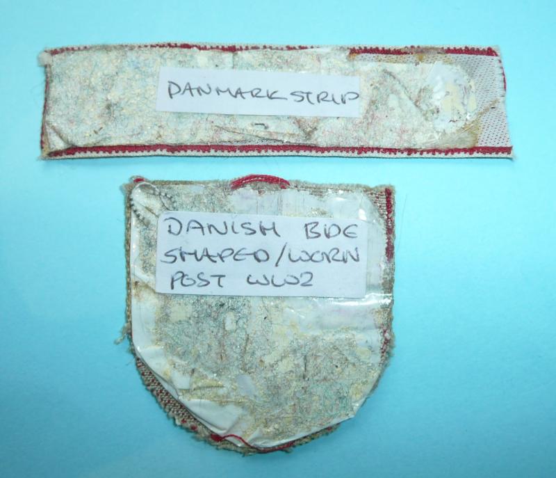 A woven cloth formation sign removed from uniform with some damage to top edge otherwise in good overall condition and with its matching "Danmark" Shoulder title. Post WW2 issues. See also my item 58859.