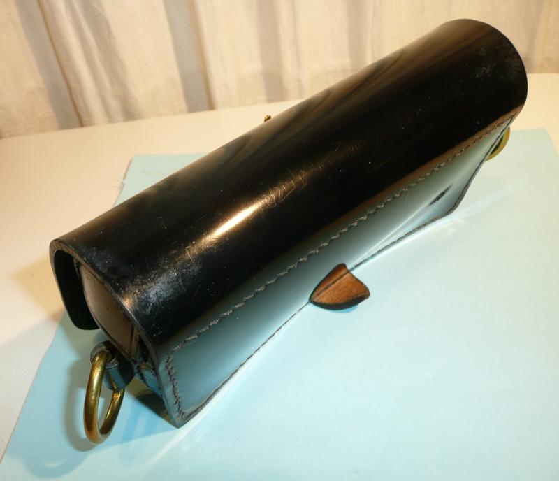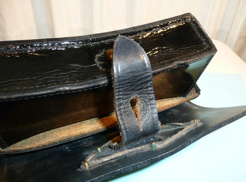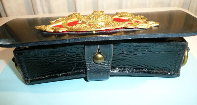 As worn by Warrant Officers and members of the Band, a full Royal coat of arms with St. Edward's (Queen's) crown, all on a scarlet red plush felt cloth backing with six original loops to the reverse (as also worn by the equivalents in the Blues but without the red felt backing). Gilt bright and in good condition. The pouch itself made from PVC plastic (faux patent leather) with brass retaining rings. Some minor marks / scratches to the faux leather but otherwise a very pleasing example and would make a fine display piece. Thanks to George, as ever, gor the correct identification.