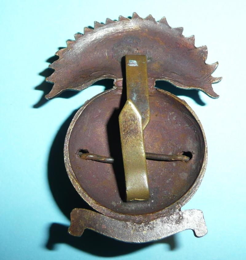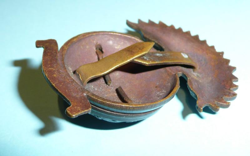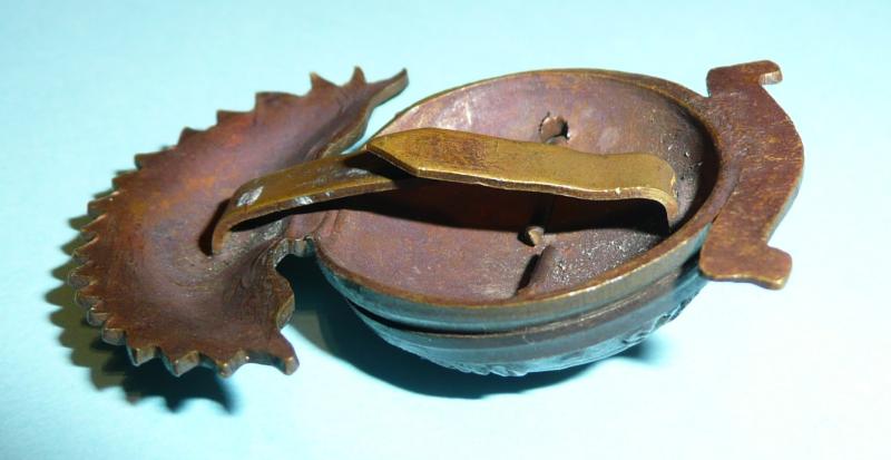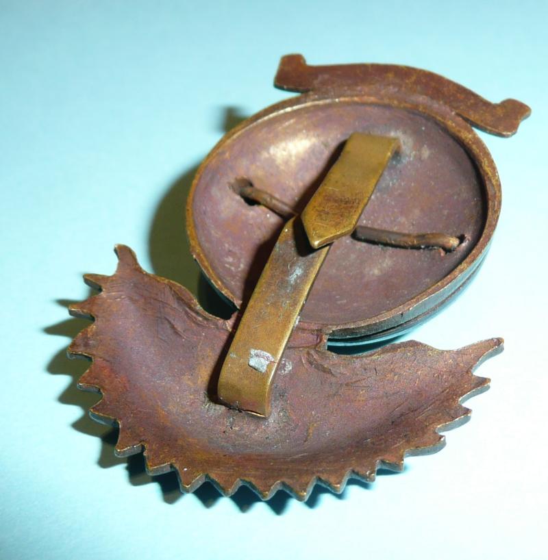 Die cast in bronze and of two piece construction, with fretted mount and scroll South Africa 1900 - 02 below. Two of two original blades to the reverse, very slight signs of fracture at point of attachment so not recommended these are opened or played with. Worn 1908 - 1924 on the SD cap.