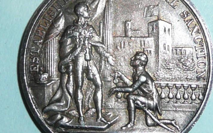 Obverse illustrating King George III receiving the medal from Colonel Crosbie on the terrace at Windsor, the castle in the background, inscribed "ESTABLISHED UNDER ROYAL SANCTION" above and dated "1785" below, engraver marked "MOSSOP. P." on the edge of the platform that the King is standing upon, reverse inscribed "REESTABLISHED BY COL: SIR H: GOUGH 1ST JANUARY 1820" in the centre, surrounded by the inscription "ORDER OF MERIT 22nd REGIMENT", with crossed branches of oak leaves and acorns at the base, measuring 36 mm in diameter, hinged silver suspension bar with lightly soiled original white ribbon, extremely fine.