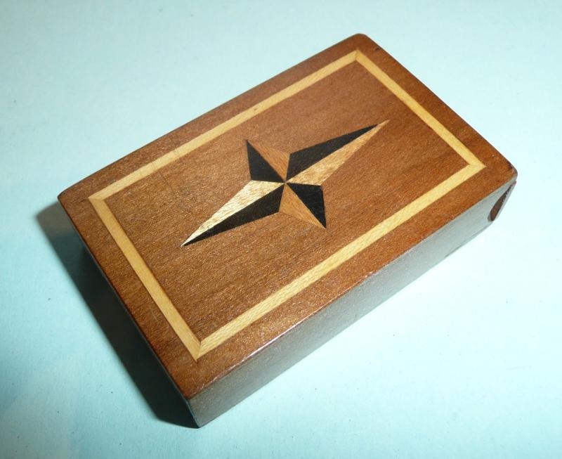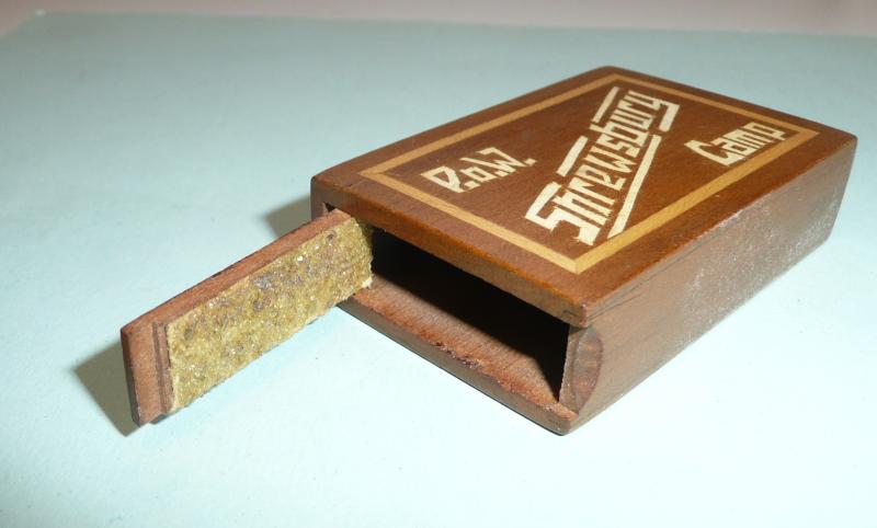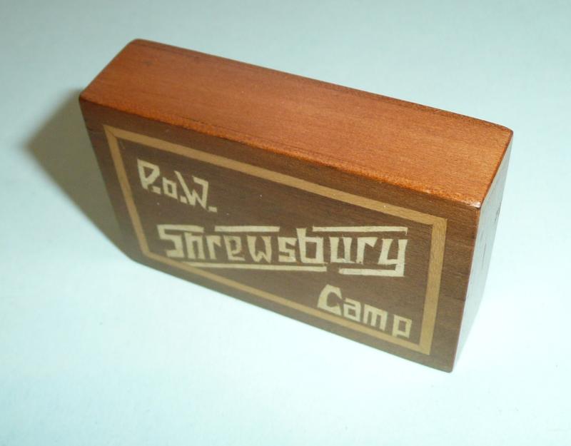 This is a very high quality inlaid wooden vesta or match safe, to the front it has ‘P.O.W. Shrewsbury camp’ and to the back a lovely inlaid star shape. Research shows that the pow camp at Shrewsbury was used to house German internees and other German prisoners captured at the various fronts (see below). The box has a flip lid to the side and on the underside of the lid a strip of sandpaper used to strike the matches. The piece comes in superb condition and measures just under 2.5 inches long.