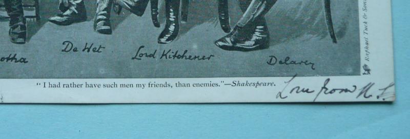 Postally used and EDVII cancelled stamp dated 1902. Sent to a Portuguese address in Lisbon. In very good condition for age. Artistic portraits of Lord Kitchener (wearing a black arm band to commemorate death of Queen Victoria) and the Boer War Generals, De Wet, Botha and Delarey. Quote from William Shakespeare below giving credit to the enemy below: "I would rather have such men as my friends, than enemies". This came to pass in WW1.