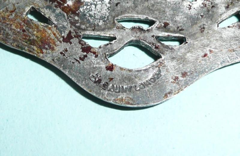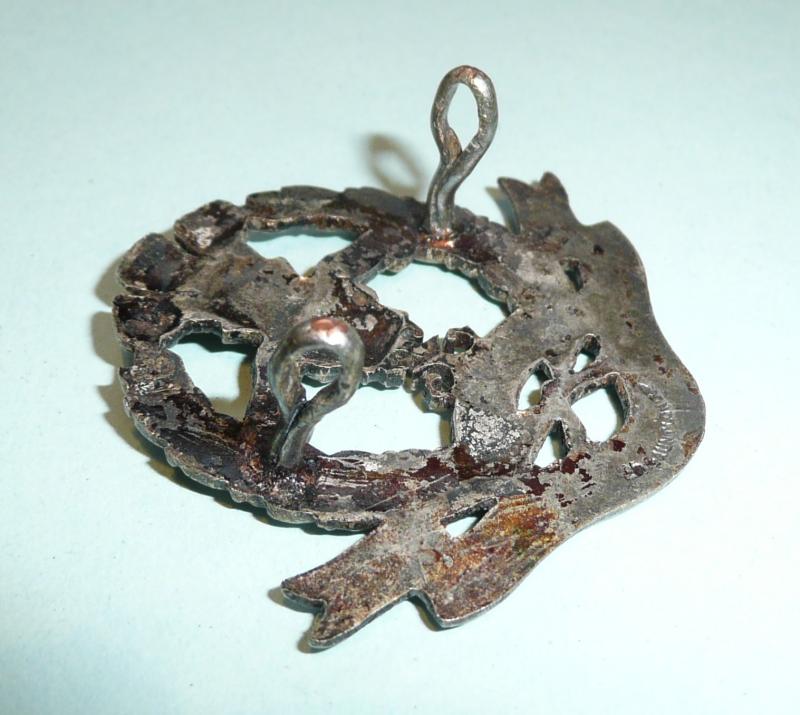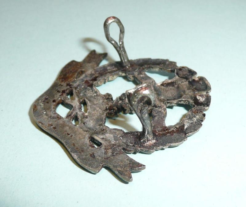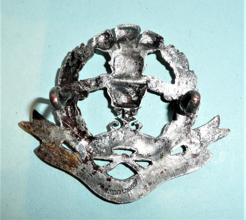 A die cast silver frosted and plated cap badge with two long loops, some twisting and service wear to loops, otherwise in very good condition with sharp detail. Maker marked JR Gaunt London.