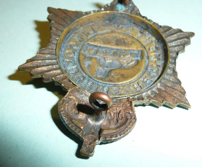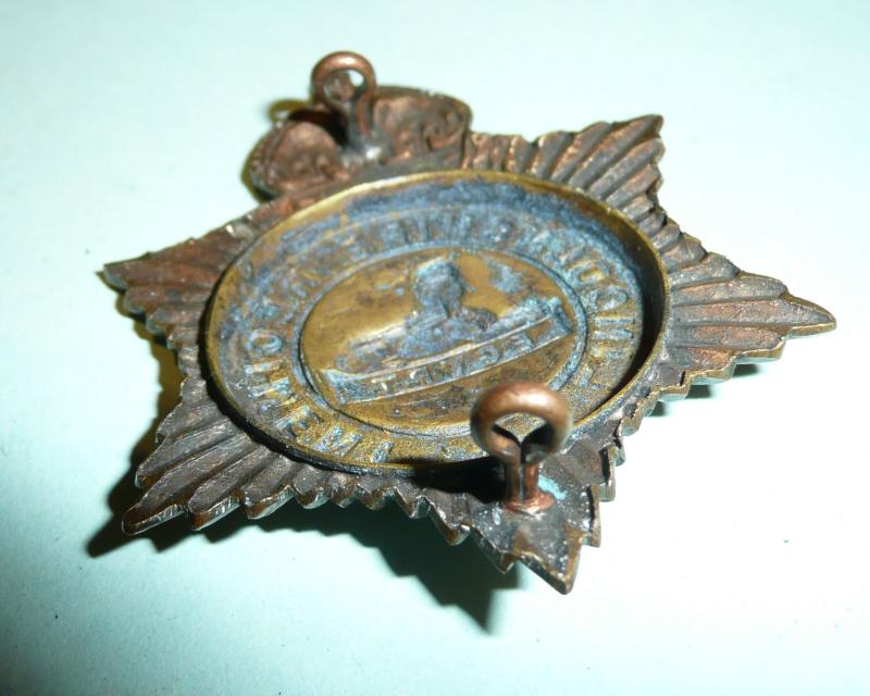 A die struck two-part construction brass unvoided example with two original loops (north -south) to the reverse. The centre disc is in a yellow brass and has been inserted and braised into a copper coloured brass star with King's Crown above. A reasonably large badge at circa 5.8cms tall. Initially a bit of a puzzle but as usual the BMBF came to the rescue where it is identified as the headdress badge worn by the Band of the 2nd Battalion of the Lincolnshire Regiment in Bermuda just prior to WW1 and was worn in the sun / tropical helmet as a pagri badge.
