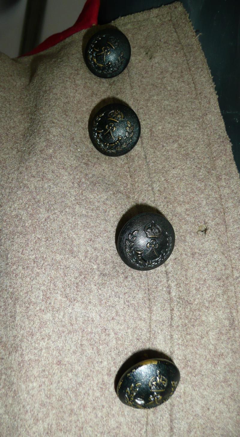 The original buttons remain on the skirt rear, but the buttons down the front of the jacket are those of the Kings Royal Rifles, which suggests that the jackets may have been returned to storage and re-used by another unit continuing to wear the Rifle Grey, who were affiliated to the KRR.